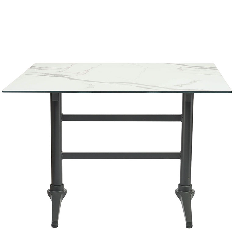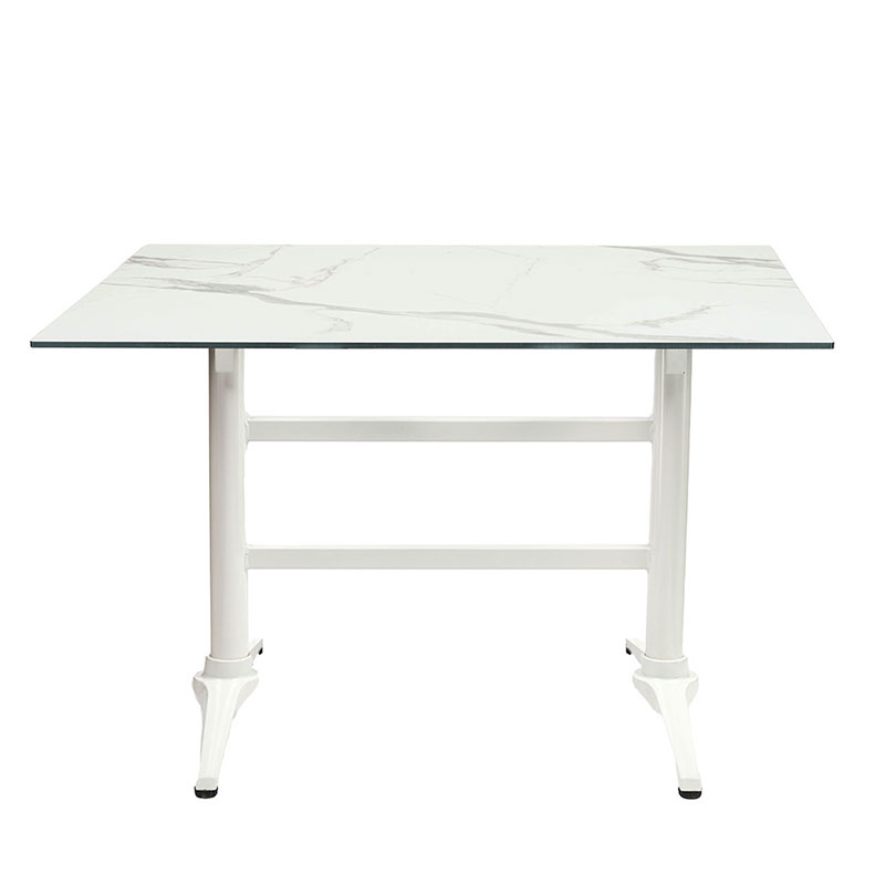 Mesa de aluminio fabricada para uso exterior y tableros rectangulares. Con un diseño de líneas sencillas apto para varios tipos de tablero e incorpora un sistema abatible.