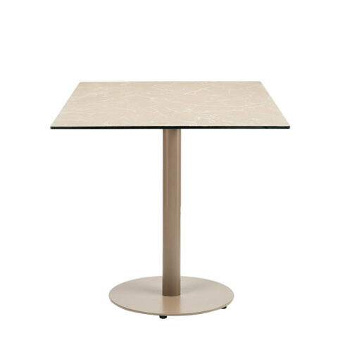 Mesa de aluminio fabricada para uso exterior. Con un diseño de líneas sencillas apto para varios tipos de tablero e incorpora un sistema abatible.