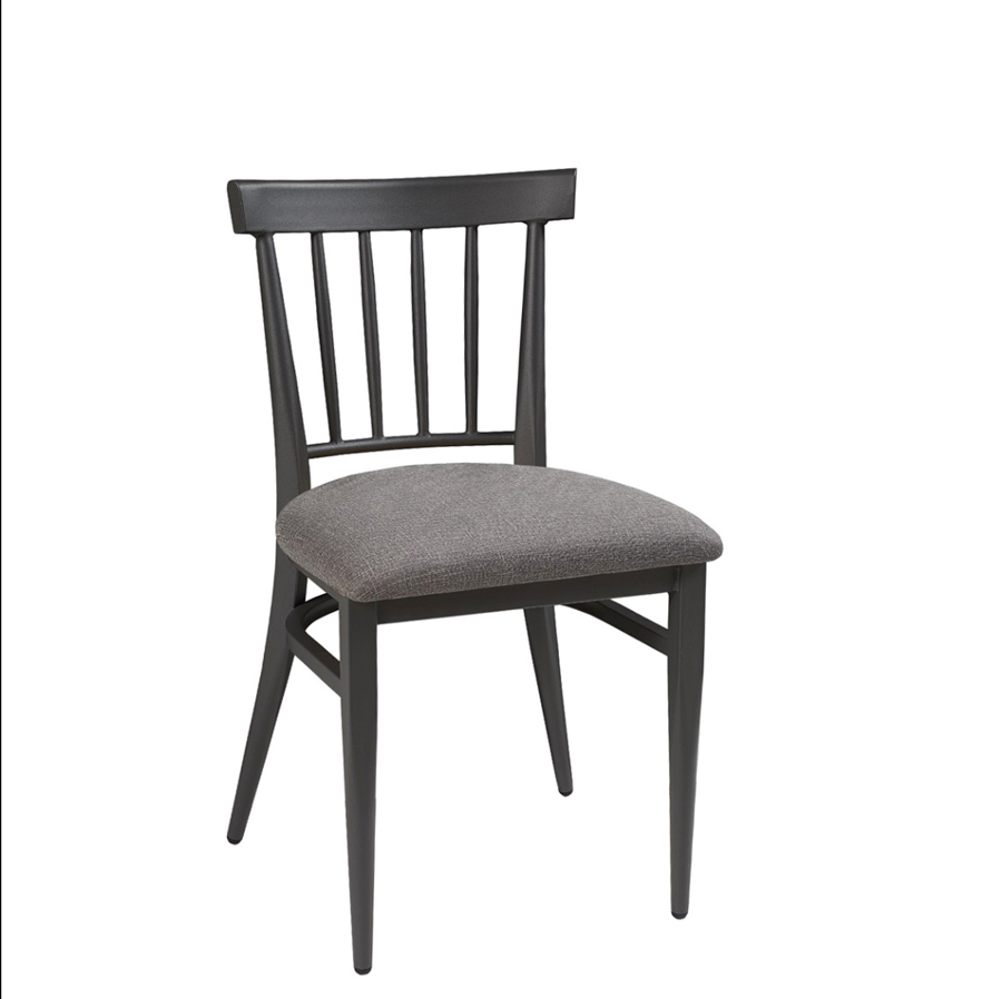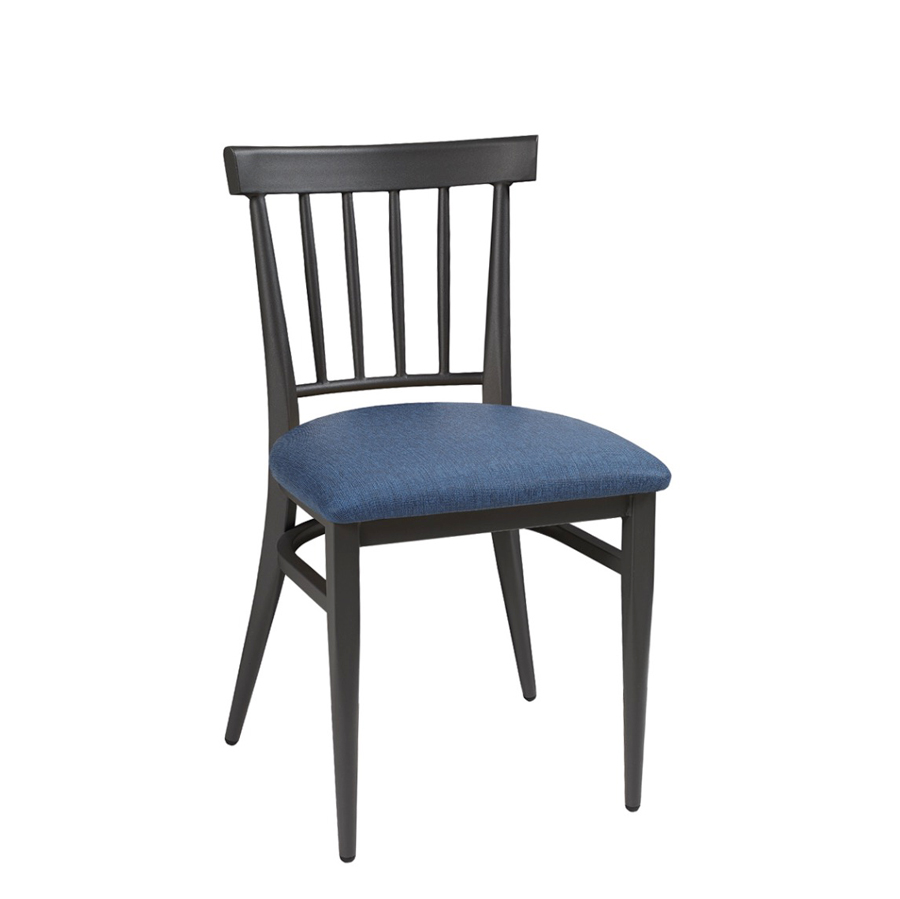 Silla de acero y líneas verticales en el respaldo con final abierto. Diseñada para uso interior ofrece múltiples variaciones de asiento.